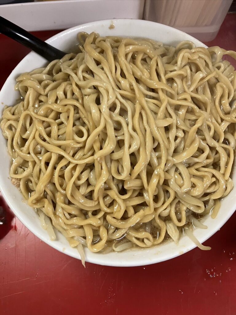 麺はヤサイの下にしっかりと埋まっており、天地返しをすると褐色に染まった麺が現れる。平打ちの中太麺で、オーションの香りがしっかり立ち、スープとの絡みも良い。麺量は大で400g以上あり、満足感も高い。