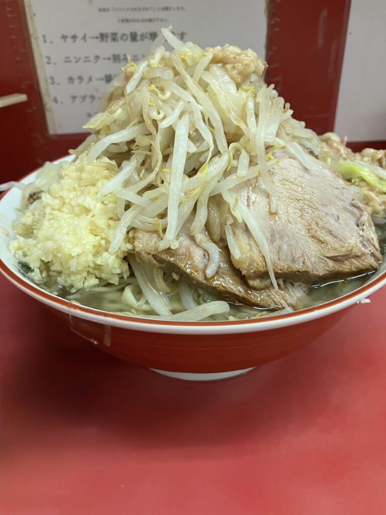 完食してロット一番抜け。麺の粉感、もやしの香り、分厚い油膜、厨房の雰囲気、そして強めの化学調味料。いろいろな要素から「これぞ二郎」という空気を感じた一杯だった。