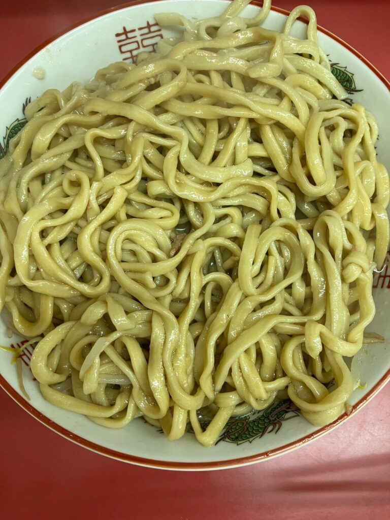 麺は自家製の太い平打ち麺。口に入れた瞬間に広がるオーションの香りが印象的。麺は太めで平打ち、軽いうねりがあり、ゴワモチな食感。湯切りがやや甘いのか、あるいは茹で湯の濁りの影響か、小麦が溶けたようなヌルっとした感触が麺にまとわりつき、そこに油が絡んでくるのが心地よい。麺量は大で350gほどで、二郎の中ではやや少なめ。